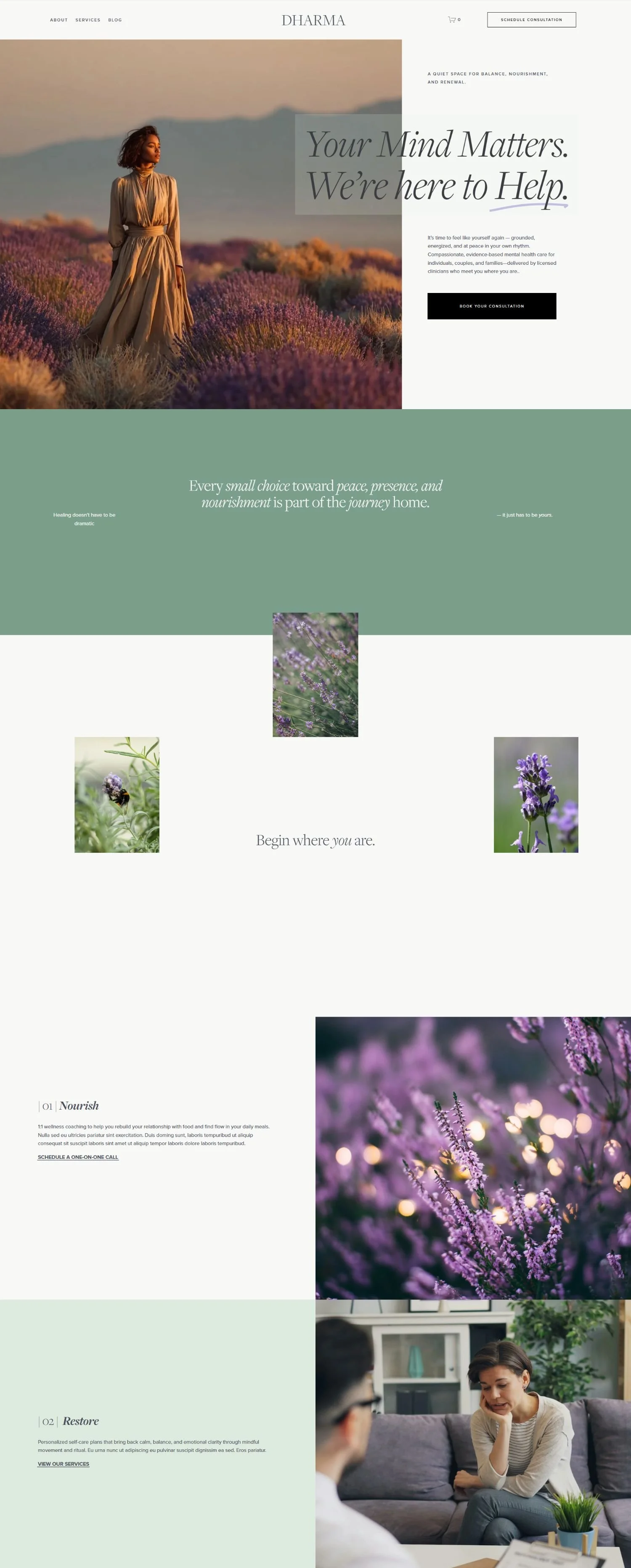 DhärmaDharma is a warm, grounded Squarespace 7.1 template crafted specifically for therapists, counselors, psychologists, social workers, and holistic mental-health practitioners who want a calm, trustworthy, and professional online presence.