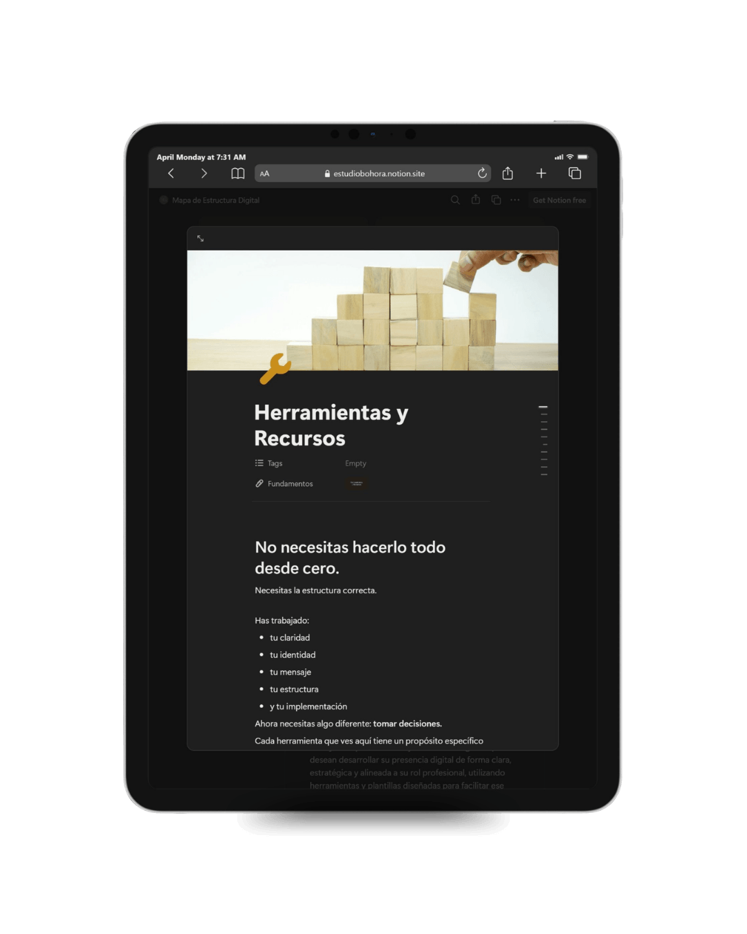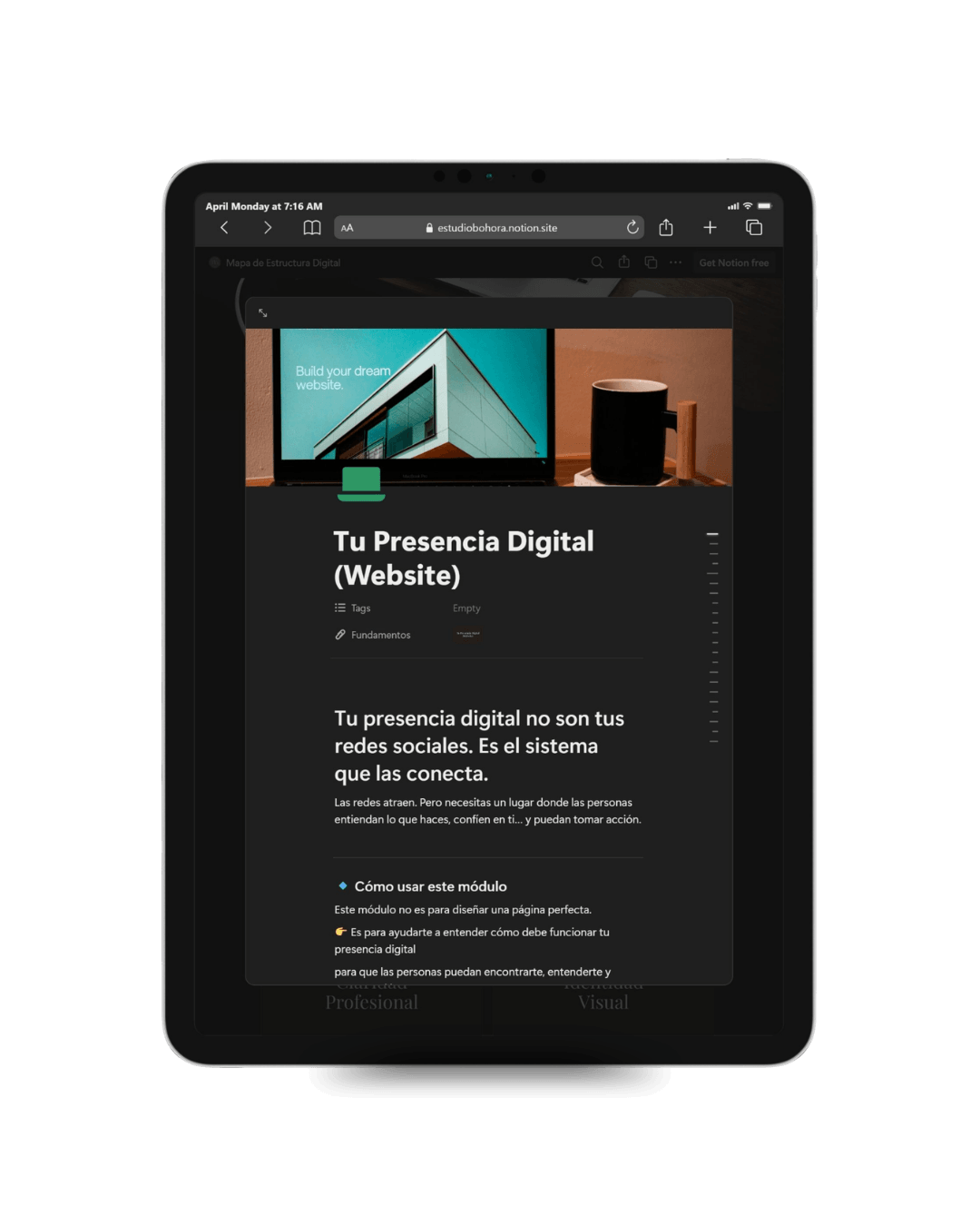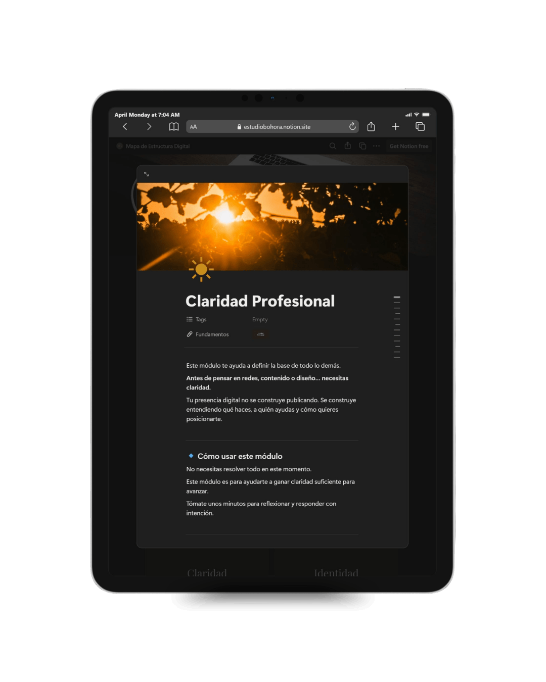 A través de un sistema paso a paso en Notion, podrás definir tu mensaje, organizar tu contenido, estructurar tu página web y alinear toda tu presencia digital con una dirección clara.