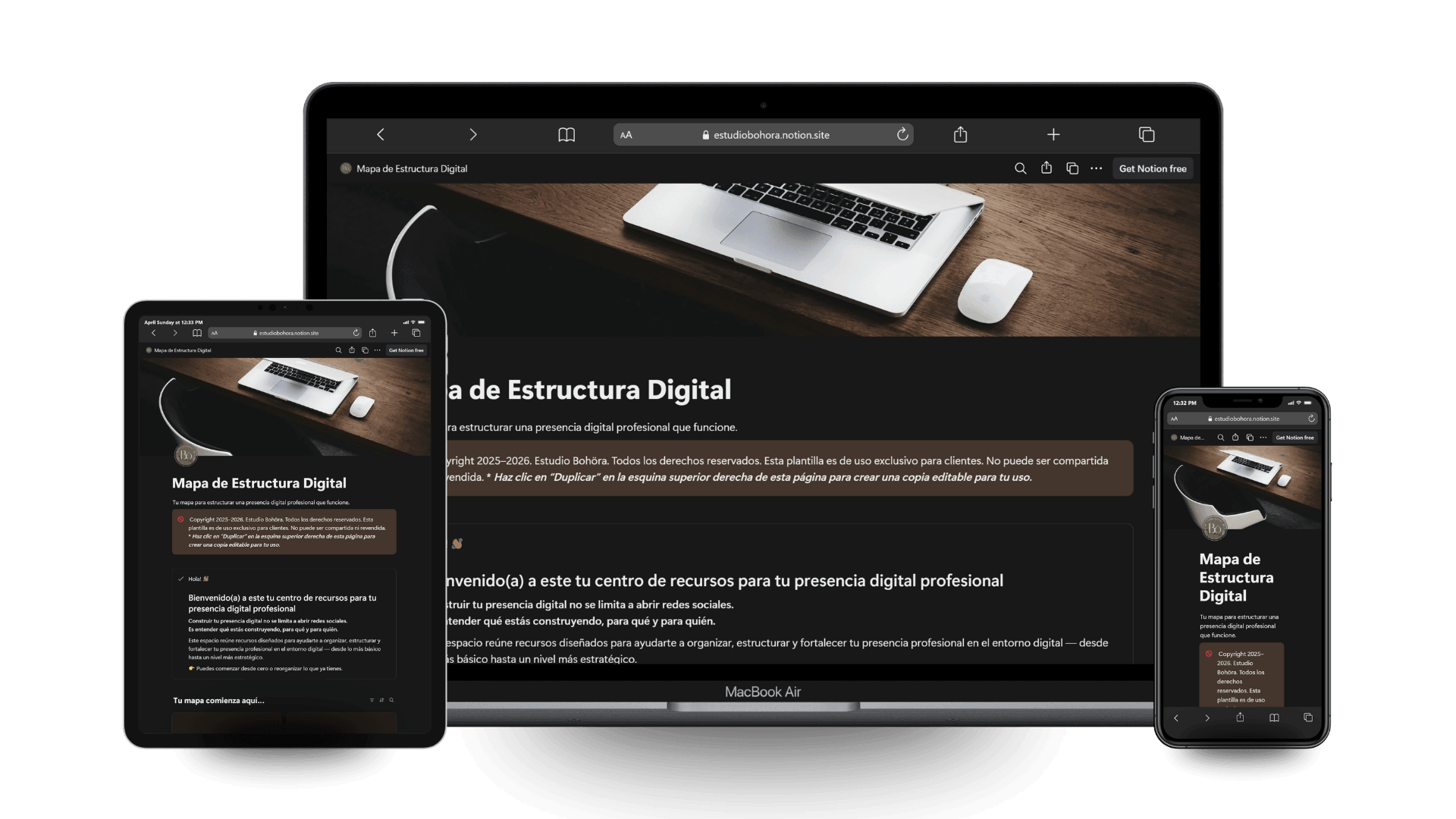 ✔ Actualizaciones futuras incluidasMapa de Estructura Digital es un sistema diseñado para profesionales de servicios que desean construir una presencia digital profesional clara, estratégica y orientada a atraer clientes.